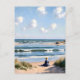 This quiet scene shows a woman sitting alone on the beach looking at the sea. The waves are gently rolling off the coast under a blue sky with dark clouds. The dunes frame the horizon, an intimate and serene atmosphere of this beautiful beach scene. She dreams about the future and thinks about her life, maybe enjoying a moment of peace and escape from the daily pressures. Her thoughts are falling into far-off places and new adventures, while at the same time bringing the sedative influence of the sea into its own action.