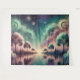 This ethereal design portrays a tranquil dreamscape where stylised trees with spiral canopies line a reflective waterway beneath a cosmic sky. Shades of teal, lavender, and rose blend seamlessly with soft clouds patterned in geometric swirls. The luminous horizon and celestial accents create a serene, surreal atmosphere that feels both futuristic and otherworldly.