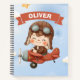 This personalised kids' notebook features a chubby, cartoon-style baby pilot flying a tiny, vintage red aeroplane! The cute little pilot wears a classic brown aviator hat and goggles. A red banner stands over the design with your child's name.