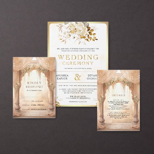 Amaze your guests with this elegant Indian wedding RSVP card featuring beautiful arches decorated with curtains and cream flowers.