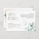 Delicate, nature inspired greenery arrangements including blue gum eucalyptus with splashes of gold and gold leaf outlines along with unique design layouts make this an exciting wedding set for any time of year. The wedding details card shown here features lush foliage borders on front and back with plenty of room to add pertinent wedding information for your guests. View the collection link on this page to see all of the matching items in this beautiful design or search ID817 to see other pieces and colour choices for this set.