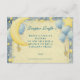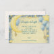 A dreamy watercolor design featuring a glowing crescent moon surrounded by hanging stars, fluffy clouds, and festive balloons in soft shades of blue and gold. Perfect for creating a magical and celestial-inspired baby shower atmosphere.