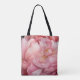 This tote bag is adorned with a dreamlike rendering of a pink peony, its petals appearing impossibly soft and fluffy, as though crafted from clouds. The flower is depicted in exquisite detail, with layers of velvety petals cascading outward, creating a voluminous, cushion-like effect that invites the viewer to rest their gaze—or their head—on its plush surface. A gentle, luminous glow seems to emanate from the peony itself, blending seamlessly into a muted pastel background that enhances its ethereal quality. The overall composition is serene and enchanting, evoking the feeling of sinking into a comforting daydream.