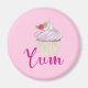 A magnet with a yummy pink cupcake with scrumptious swirls of pink frosting with a yellow cupcake holder. A raspberry with stem and leaves on top. Dreamy and delicious. Text says Yum in a fancy trendy font. Set on a pastel pink backdrop.