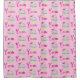 A shower curtain designed with a repeating pattern of an illustration of a yummy cupcake with pink swirls and a berry with leaves nestled in the frosting. "Yum" written in hot pink with a fancy trendy font. Set on a soft pink background.