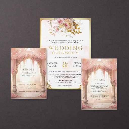 Amaze your guests with this elegant all in one Indian wedding invite featuring beautiful arches decorated with curtains and pink flowers. Modern gold typography with QR Code for online RSVP. Simply add your event details on this easy-to-use template and adorn this card with your favourite photo to make it a one-of-a-kind invitation.