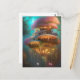Beautiful dreamscape with a multi-level pink treehouse at night. Postcard features digital art generated using AI software.