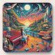 Escape to a world of musical inspiration and natural beauty with our captivating collection. This vibrant scene blends urban and natural elements seamlessly, creating a surreal and harmonious atmosphere. A woman sits at a red piano on a wooden deck, overlooking a meandering river that leads to a distant city skyline. The sky is filled with swirling patterns and birds, while the landscape features rolling hills dotted with trees and buildings. This image evokes a sense of tranquillity and creativity, perfect for music lovers and nature enthusiasts alike.