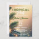 This customisable tropical party invitation exudes a vibrant and elegant graphic style. Against a warm, golden sunset backdrop with bokeh light effects, lush green palm leaves adorn the top, setting the tropical theme. The text is fully customisable. Perfect for milestone birthdays or any tropical-themed celebration!