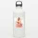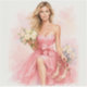 A beautiful woman in a flowing pink dress holds a bouquet of flowers and a pair of high heels in this elegant watercolor illustration.
