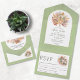 Tropical dried palm leaves, pampas grass and protea flowers sage green arch all in one wedding invitation. This lovely wedding design features an arch frame on sage green stained background and detached RSVP card. In the frame there is a bouquet of dried palm leaves, protea flowers and pampas grass.