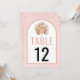 Floral arch with tropical dried palm leaves, pampas grass and protea flowers wedding table number card. This lovely wedding design features an arch frame on soft pink stained background. In the frame there is a bouquet of dried palm leaves, protea flowers and pampas grass.