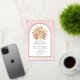 Soft blush pink arch real gold foil wedding invitation with tropical dried palm leaves, pampas grass and protea flowers. A gold foil arch frame is placed on a soft pink stained background. A bouquet of dried palm leaves, protea flowers, and pampas grass is displayed in the frame.