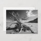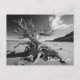 Black and white photograph of a sun-bleached tree trunk as driftwood on a beach at low tide.