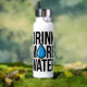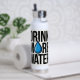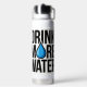 Minimalist and bold typography design featuring the motivational phrase 'DRINK MORE WATER' in clean black lettering. The centerpiece is a vibrant blue water droplet with a subtle gloss finish, symbolizing hydration and purity. Set against a clean white background, this graphic is perfect for fitness enthusiasts, wellness posters, water bottles, and healthy lifestyle reminders. The high-contrast vector style ensures maximum visibility and impact for print-on-demand products."