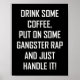"DRINK SOME COFFEE, PUT ON SOME GANGSTER RAP AND JUST HANDLE IT!" by Monkey Business Graphic Design.