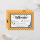On the back, The saying "Drink up Witches" with a witch on a broom with a cat and a martini. Black silhouette on orange. On the front a black polka-dot border.