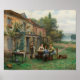 This design features a painting by the American artist Daniel Ridgway Knight (1839–1924). It shows a French family drinking coffee in the garden. A woman and two girls are sitting around a table with cups in front of them. There is also a young boy walking towards the family at the table with a flash of coffee in his hand; he is going to fill their cups. The female family members are chatting with each other contentedly. The house and garden are quaint and attractive. There is a river in the distance.