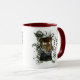 Photorealistic airbrush painting of a tiger still alert while taking a drink at a jungle stream, artistically enhanced by a frame of floral grunge swirls. A unique design for all tiger lovers!