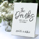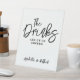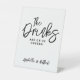 This custom sign features a simple black and white design with a clean white background and crisp black fonts for a timeless look. “The Drinks Are On Us” is displayed in a mix of elegant handwritten script and classic serif fonts, with “Cheers” adding a fun finishing touch. It’s a stylish way to let guests know it’s an open bar.