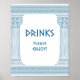 Elegant Toga party 'Drinks, please enjoy' table sign featuring elegant temple pillars and Greek meander pattern in blue. Perfect for weddings, engagements, graduation parties, anniversaries, save the dates, bachelorette and birthday parties.
