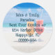 Round return address envelope seals with drinks on the beach image.  Anyone living a casual, seaside lifestyle will love this sticker.  Frosty cocktails sit on a sunny beach with tropical blue water in the distance.  This is the background image for your name and address which is printed in chunky, handwritten style.  Other sticker shapes may work depending on your text.  Don’t let any wording get near the edge.