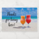 Drinks on the beach wedding labels for a mini-sparkling wine bottle. A tropical scene with turquoise ocean water and sunny beach sand is the background for your text. Two frosty cocktails sit on the sand in a paradise location. Say thank you to guests attending a beach wedding.