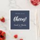 Customisable navy blue background and white typography wedding napkins. Customisable Drink on us Cheers! typography, followed by newlyweds names and wedding date.