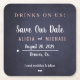 Simple rustic casual Drinks on us! white and blush pink typography script, name, date, and place personalised wedding save the date coaster on a dark midnight navy blue background.