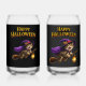 Sip your favourite spooky bruise in style with this magical witch kitten can shaped glass featuring a cheerful tabby kitten flying through the night sky on her broomstick complete with a purple witches hat cape and a glowing lantern. This high detail illustration is set against a sleek black wrap with bold happy Halloween lettering making it a perfect addition to your October barware collection or a delightful gift for cat lovers.