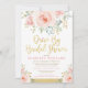 This beautiful drive through bridal shower invitation features pretty watercolor blush pink roses and green and gold greenery.