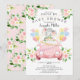 Drive by baby shower design featuring a cute Elephant, pink car with gifts, balloons & pretty blue flower bouquet. Flip our invite over to view a coordinating floral back for an extra special touch..