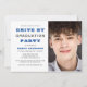 Celebrate your graduate's achievements with friends and family from a safe distance with a drive by graduation party! The front of this simple invite features his or her favourite photo on one side (vertical orientation is best), modern dark blue and black typography and easily customised party details, including where and when to drive by, gift drop off and treats areas, safety precautions, whether he or she will open the gift during the party or host a live facebook, instagram or other online event to unwrap the gifts and where to get more information. On the reverse of the invitation you can add his or her school information and class year under an illustration of a graduation cap.