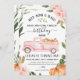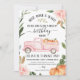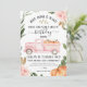 Gorgeous greenery and floral pumpkin invitation with a pink truck filled with pumpkins.
