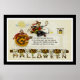 Vintage Halloween greeting card illustration with text "Drive dull care away from you so the witches can't cast their charms, hang an owl's wishbone over the door, it will shield you from all the harm."