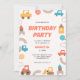 A whimsical and colourful invitation template designed for a kids' birthday party. The layout features playful illustrations of toy cars, trucks, lollipops, clouds, and small houses, bordered by curving roads. The centre is left blank for custom text, making it ideal for adding party details. The design's pastel tones and soft style create a cheerful and friendly vibe.
