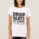 This bold graphic t-shirt features the impactful slogan "DROP BEATS, NOT BOMBS." in large, modern black lettering, paired with fun, cheerful cartoon mascots along the bottom. The design blends a strong peace and music message with playful artwork, making it perfect for music lovers, peace advocates, or anyone wanting a positive vibe.