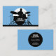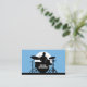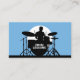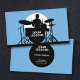 A business card for a drum teacher or a drummer. It comes with a silhouette of a drummer playing drums and a white sun behind, all on a blue background. On the back, there is contact information in a black circle.