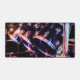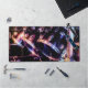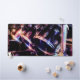 The artwork by ZoeSPEAK on this Desk Mat is an original photograph of a drum set. The shiny black drums with their silvery rims reflect the colours of the lights in the studio, blues, reds and greens. Cymbals above the drums wait to be struck.