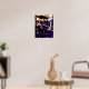 The artwork on this Poster is an original photograph of a drum set. The shiny black drums with their silvery rims reflect the colours of the lights in the studio, blues, reds and greens. Cymbals above the drums wait to be struck. The photo is called “The Drummer”, since the drummer can be found in the picture. But this text can be personalised, or deleted if you prefer.
