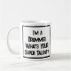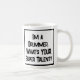Funny slogan on a Coffee mug that says "I'm a Drummer. What's YOUR super talent?". Coffee Mug for a Drummer. Black and white bold text.