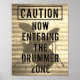 This cool, grungy drum poster with features a drum kit silhouette and the caption: CAUTION - Now Entering The Drummer Zone.