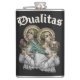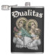 At the centred mirrored saint-figures stands, their serene expressions betrayed by what they bear: one offers a bleeding heart, the other a decaying skull. Framed by golden halos and draped in faded white robes, saints of both grace and grief. The Latin Title "Dualitas" anchors the design, reminder, that everything holy carry their shadows.