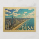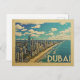 Dubai design in Vintage Travel style featuring a coastal scene with the beach and skyline of Dubai.
