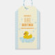 One lucky duck! First birthday featuring a rubber duck and bubbles against a light blue gingham and pale yellow background with orange text