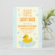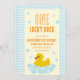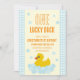 One lucky duck! First birthday featuring a rubber duck and bubbles against a light blue gingham and pale yellow background with orange text