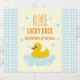 One lucky duck! First birthday featuring a rubber duck and bubbles against a light blue gingham and pale yellow background with orange text