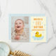 One lucky duck! First birthday featuring a rubber duck and bubbles against a light blue gingham and pale yellow background with orange text. Photo template via Pixabay licensed under CC0 and must be replaced with your own photo