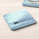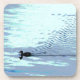 This very simply designed coaster features a single silhouetted duck moving across the water, leaving a wake of ripples behind. The minimal colours are pale blue, grey, white, turquoise, green and black.