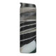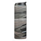 A photo of duck feathers adorns this water container creating horizontal stripes of feathers. The black and grey bird feathers add a touch of nature and a unique abstract element to this modern tumbler.